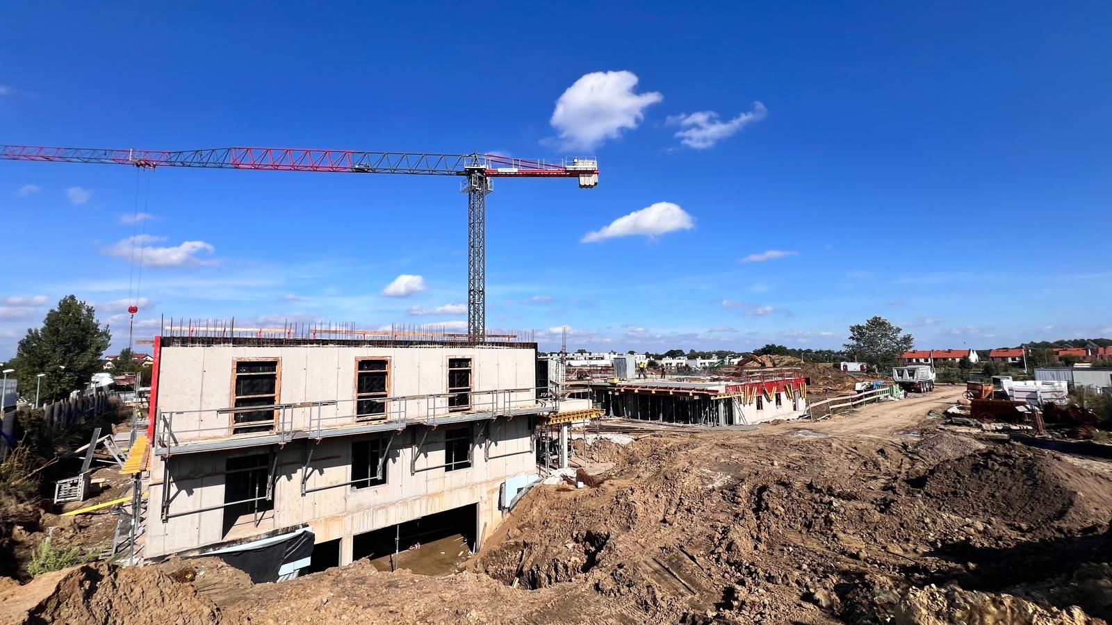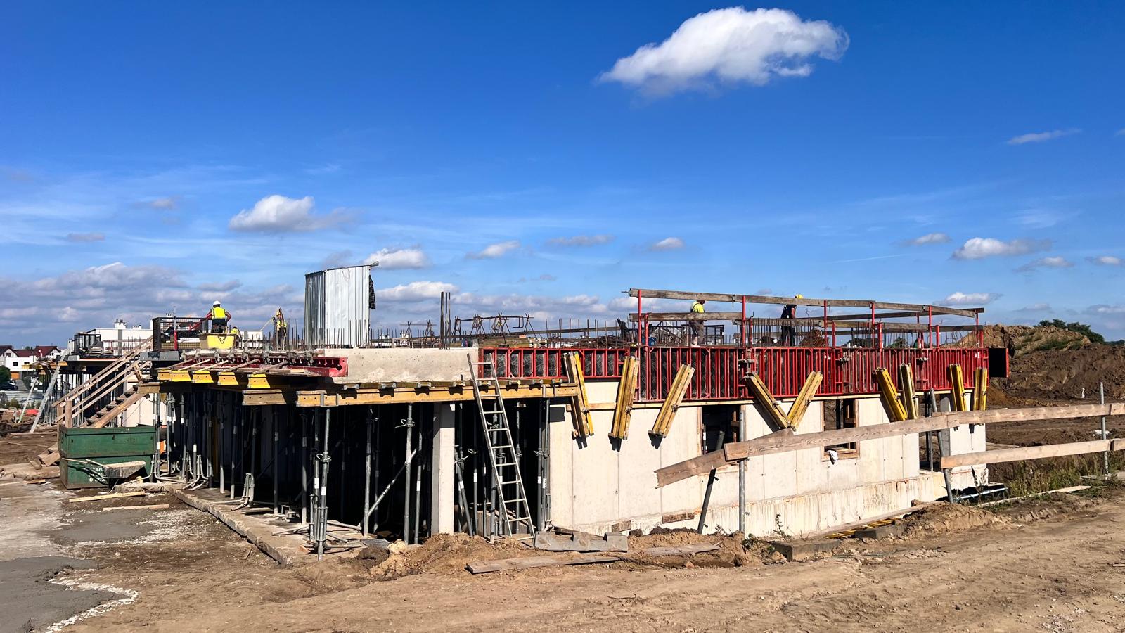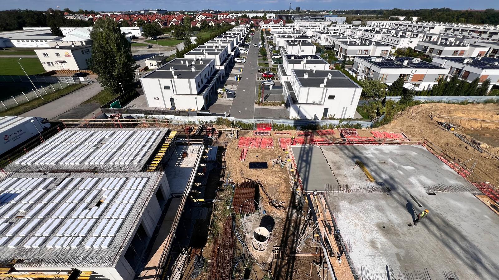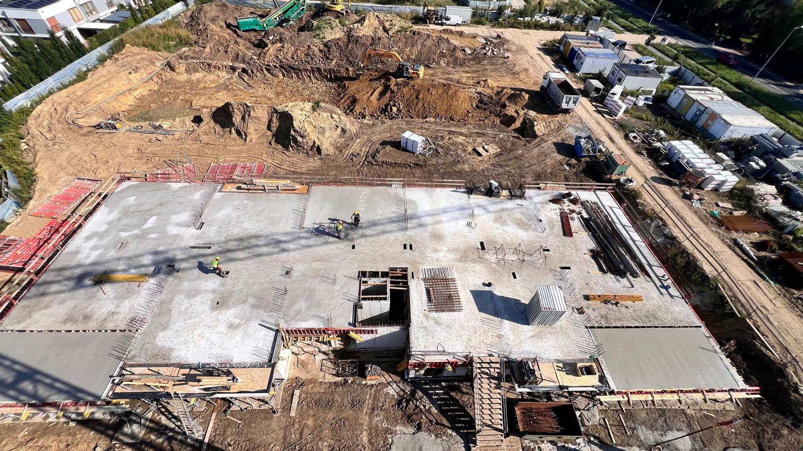 Wykonaliśmy konstrukcję kondygnacji podziemnych budynków 1 i 2 wraz z izolacją oraz ściany parteru. Trwają prace konstrukcyjne na 1 piętrze.