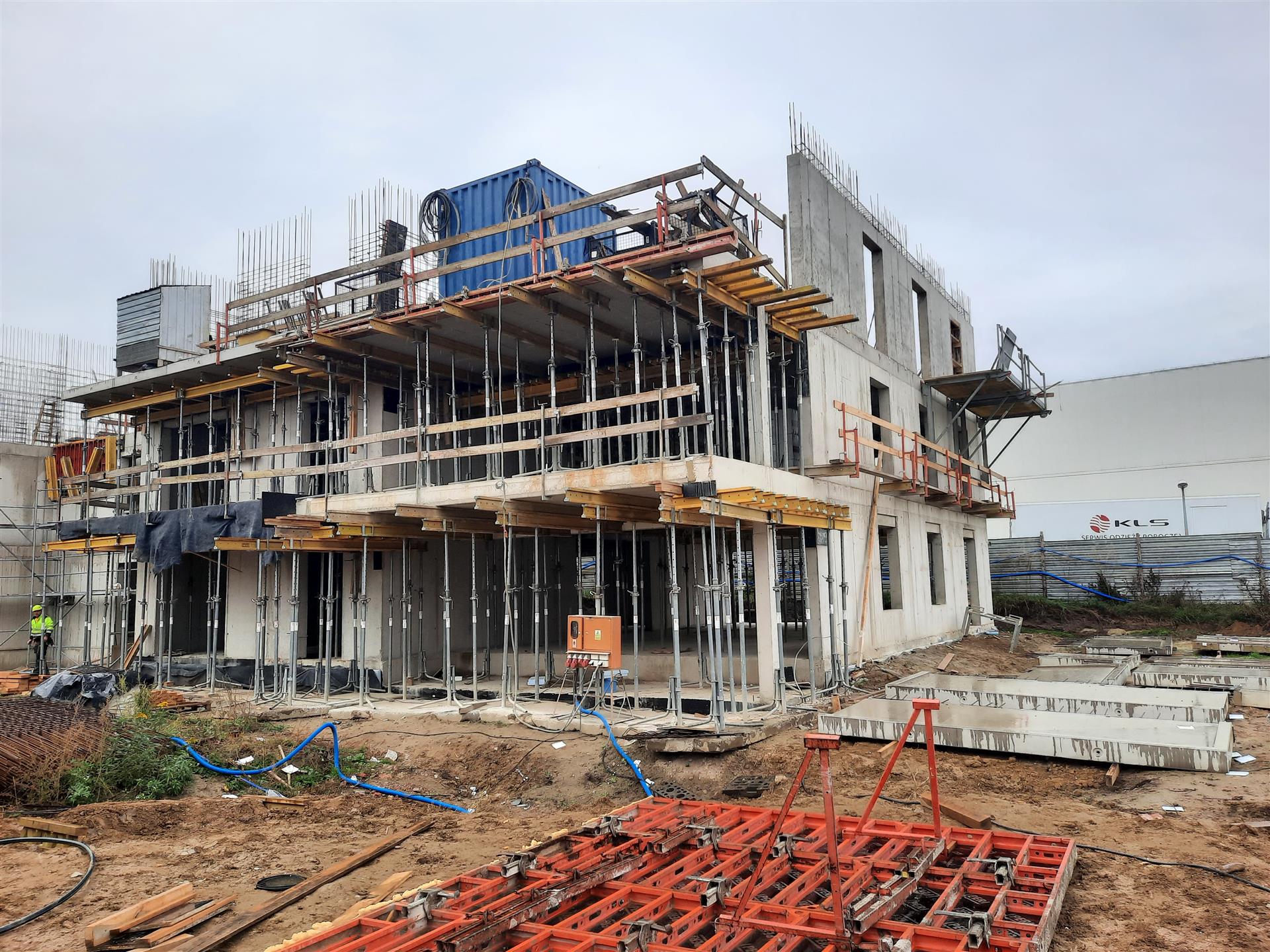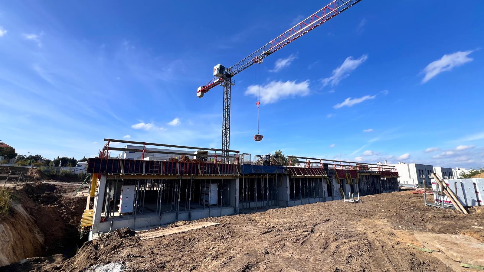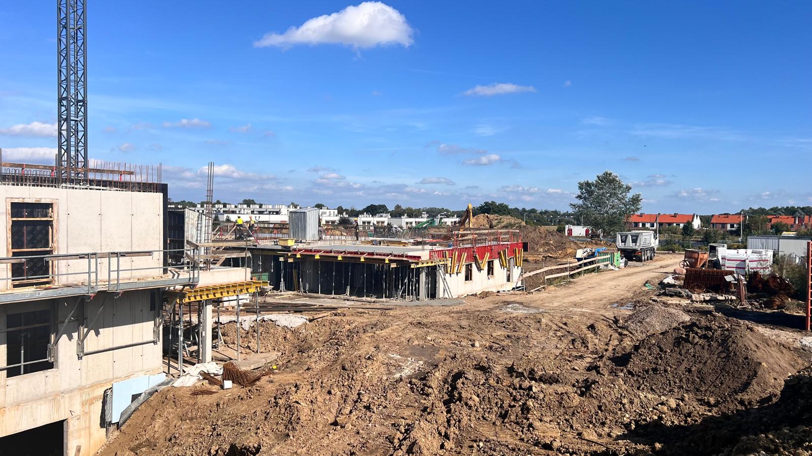 Wykonaliśmy konstrukcję kondygnacji podziemnych budynków 1 i 2 wraz z izolacją oraz ściany parteru. Trwają prace konstrukcyjne na 1 piętrze.