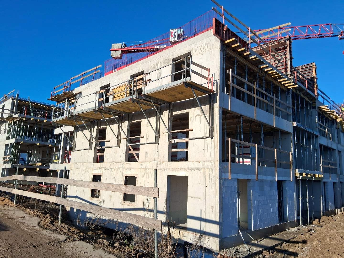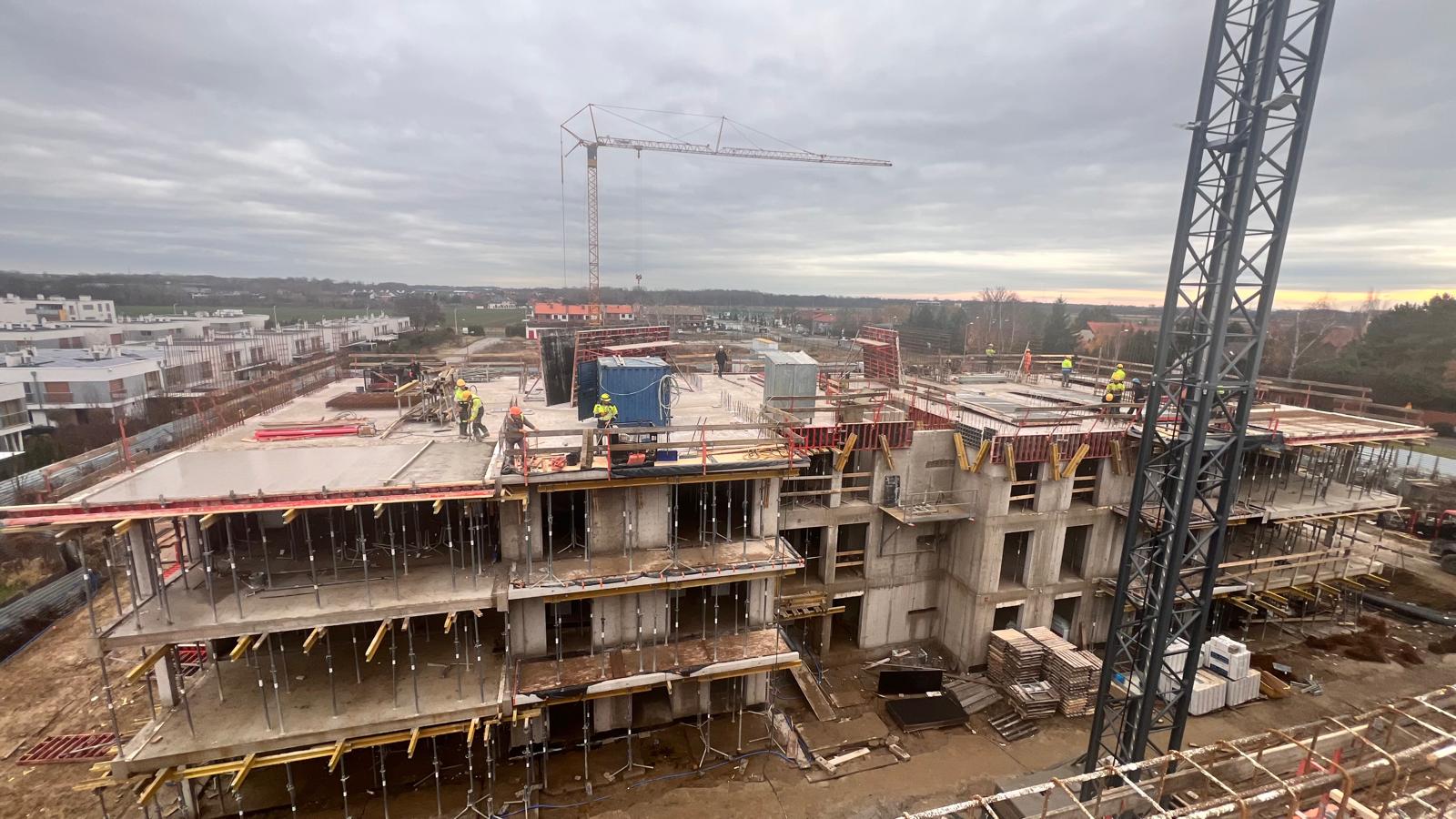 Zakończyliśmy wykonanie konstrukcji kondygnacji parteru oraz I i II piętra w budynkach 1 i 2. Obecnie trwają prace konstrukcyjne III piętra, a inwestycja zbliża się do etapu zamknięcia konstrukcji obu budynków. Równolegle realizowane są ściany działowe oraz instalacje wewnętrzne mieszkań na parterze, a także instalacje wewnętrzne w garażu. Prace przebiegają zgodnie z harmonogramem.