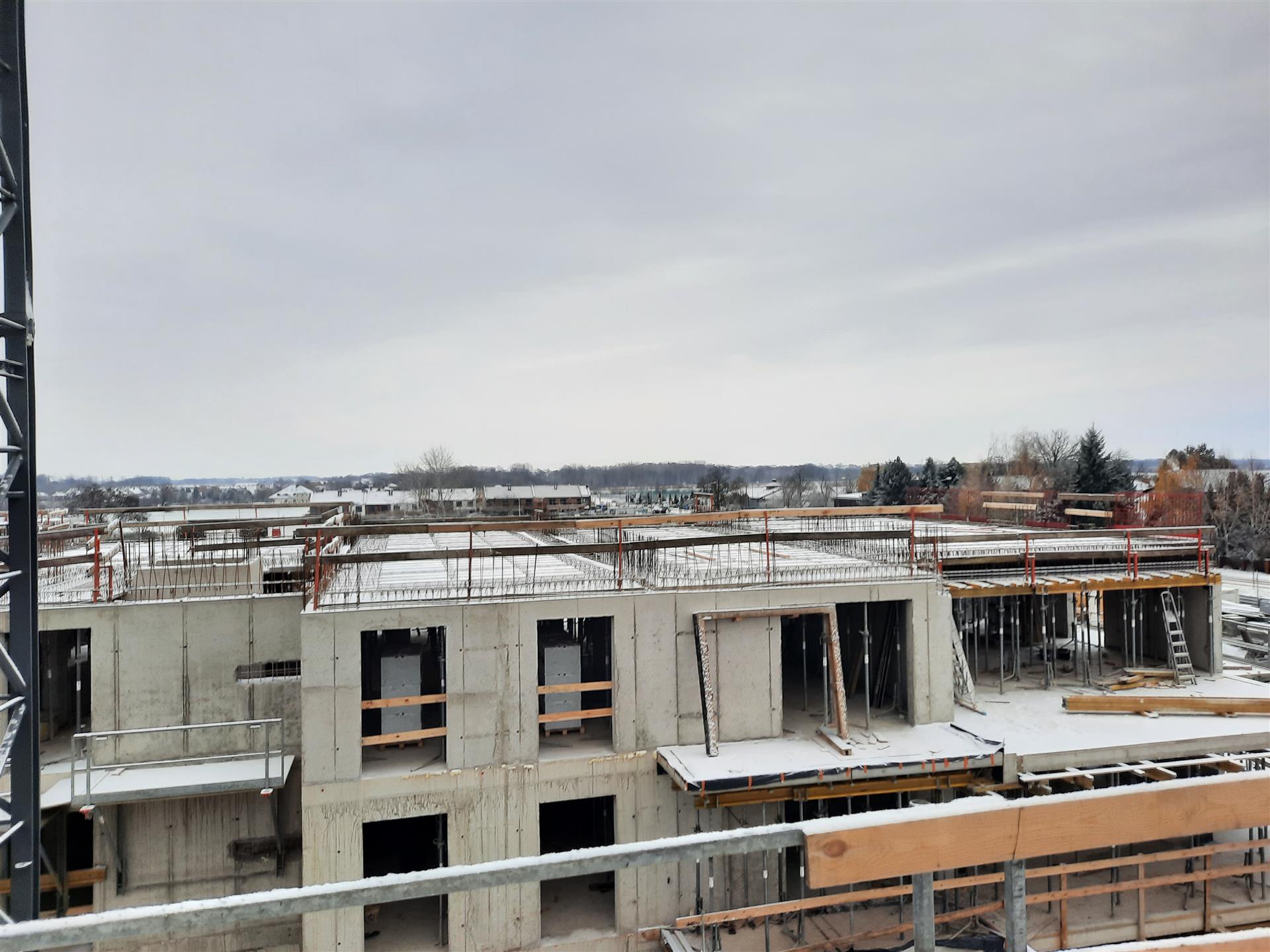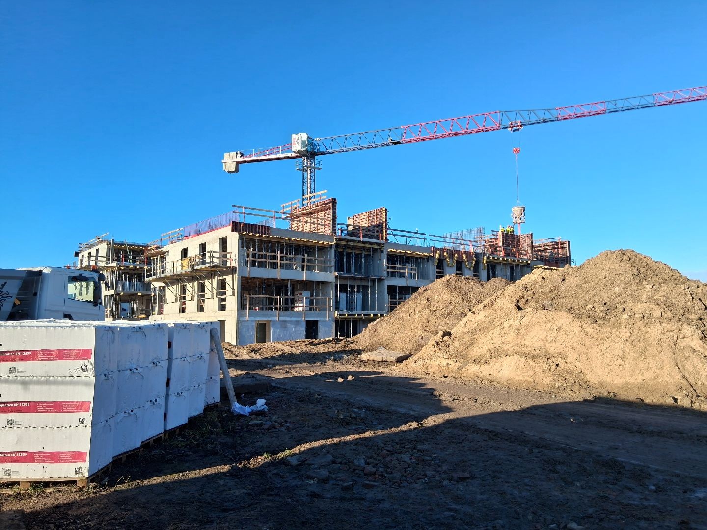 Zakończyliśmy wykonanie konstrukcji kondygnacji parteru oraz I i II piętra w budynkach 1 i 2. Obecnie trwają prace konstrukcyjne III piętra, a inwestycja zbliża się do etapu zamknięcia konstrukcji obu budynków. Równolegle realizowane są ściany działowe oraz instalacje wewnętrzne mieszkań na parterze, a także instalacje wewnętrzne w garażu. Prace przebiegają zgodnie z harmonogramem.