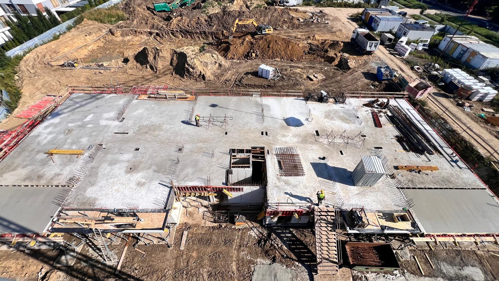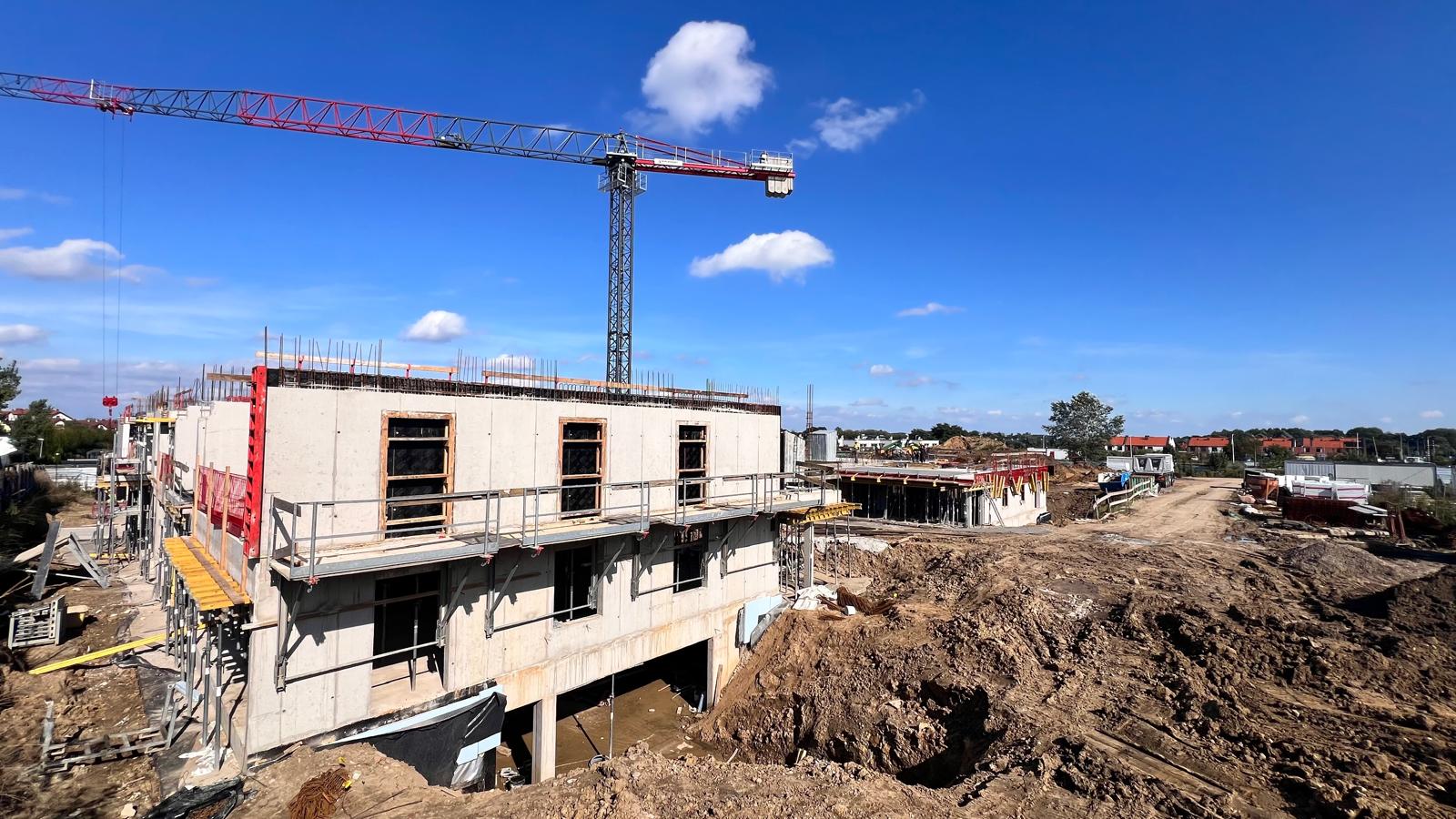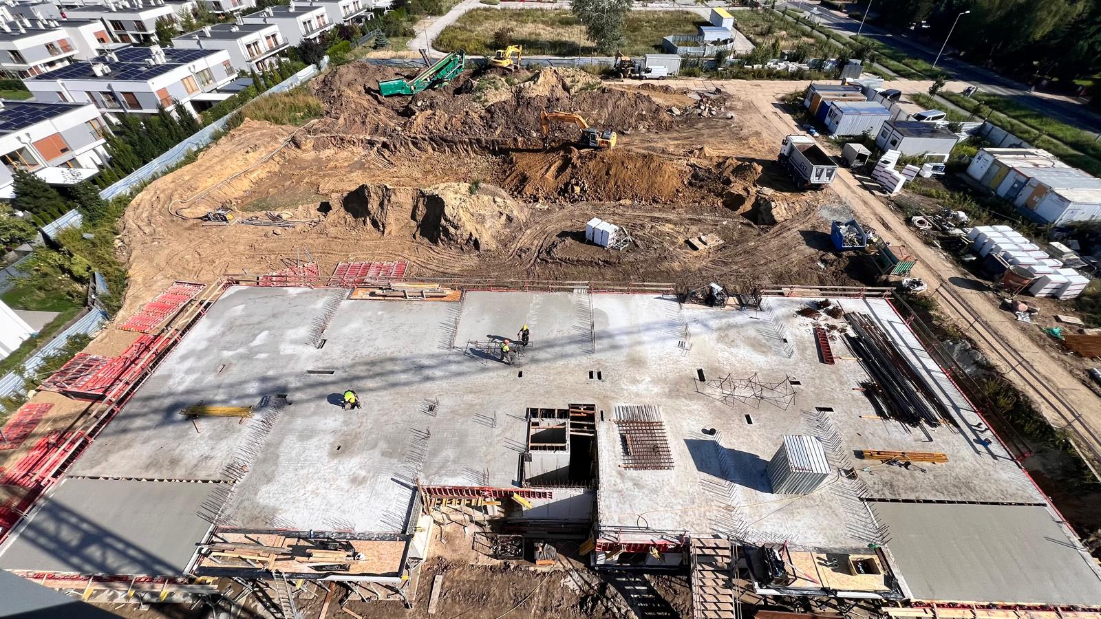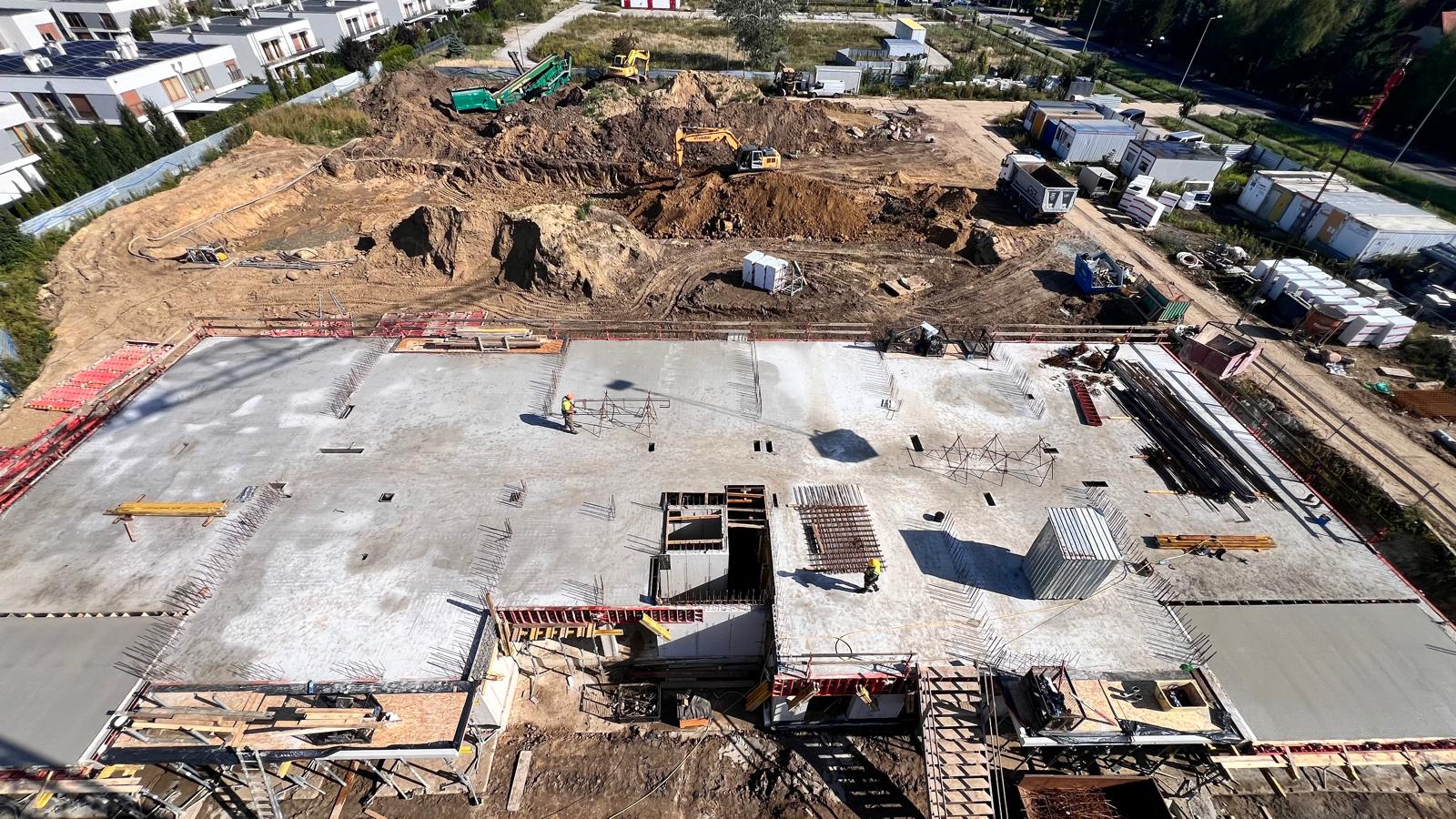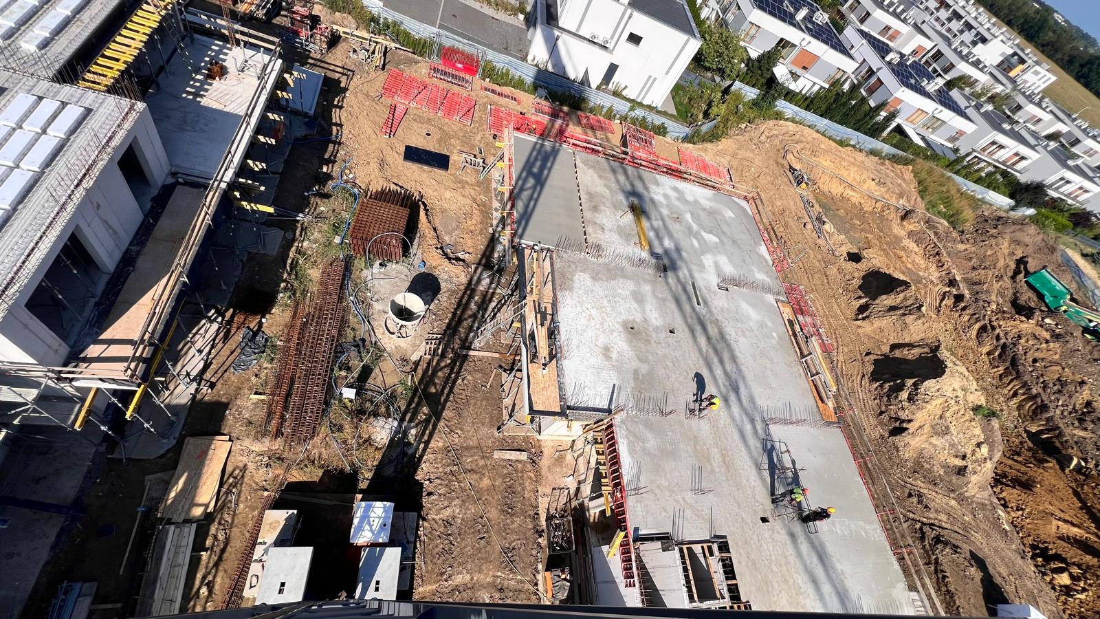 Wykonaliśmy konstrukcję kondygnacji podziemnych budynków 1 i 2 wraz z izolacją oraz ściany parteru. Trwają prace konstrukcyjne na 1 piętrze.