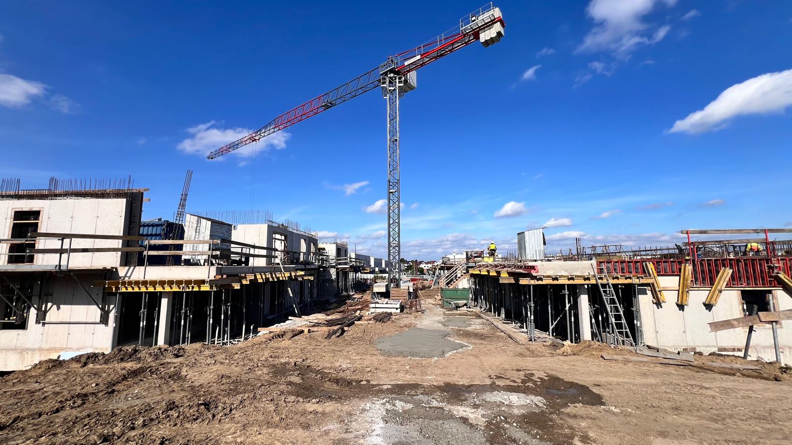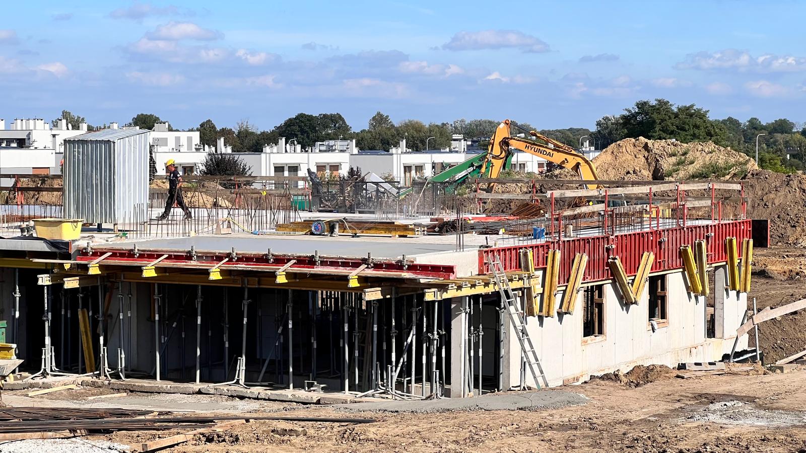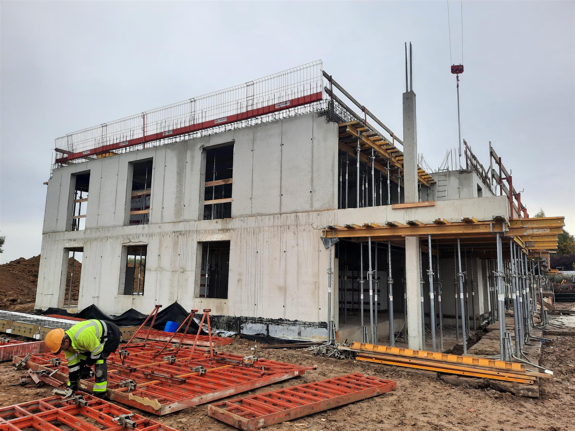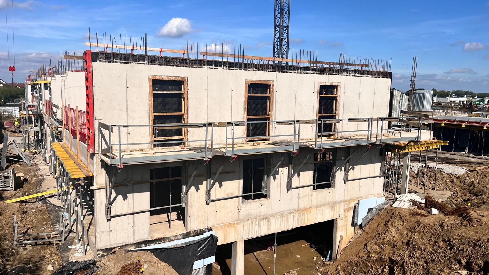 Wykonaliśmy konstrukcję kondygnacji podziemnych budynków 1 i 2 wraz z izolacją oraz ściany parteru. Trwają prace konstrukcyjne na 1 piętrze.