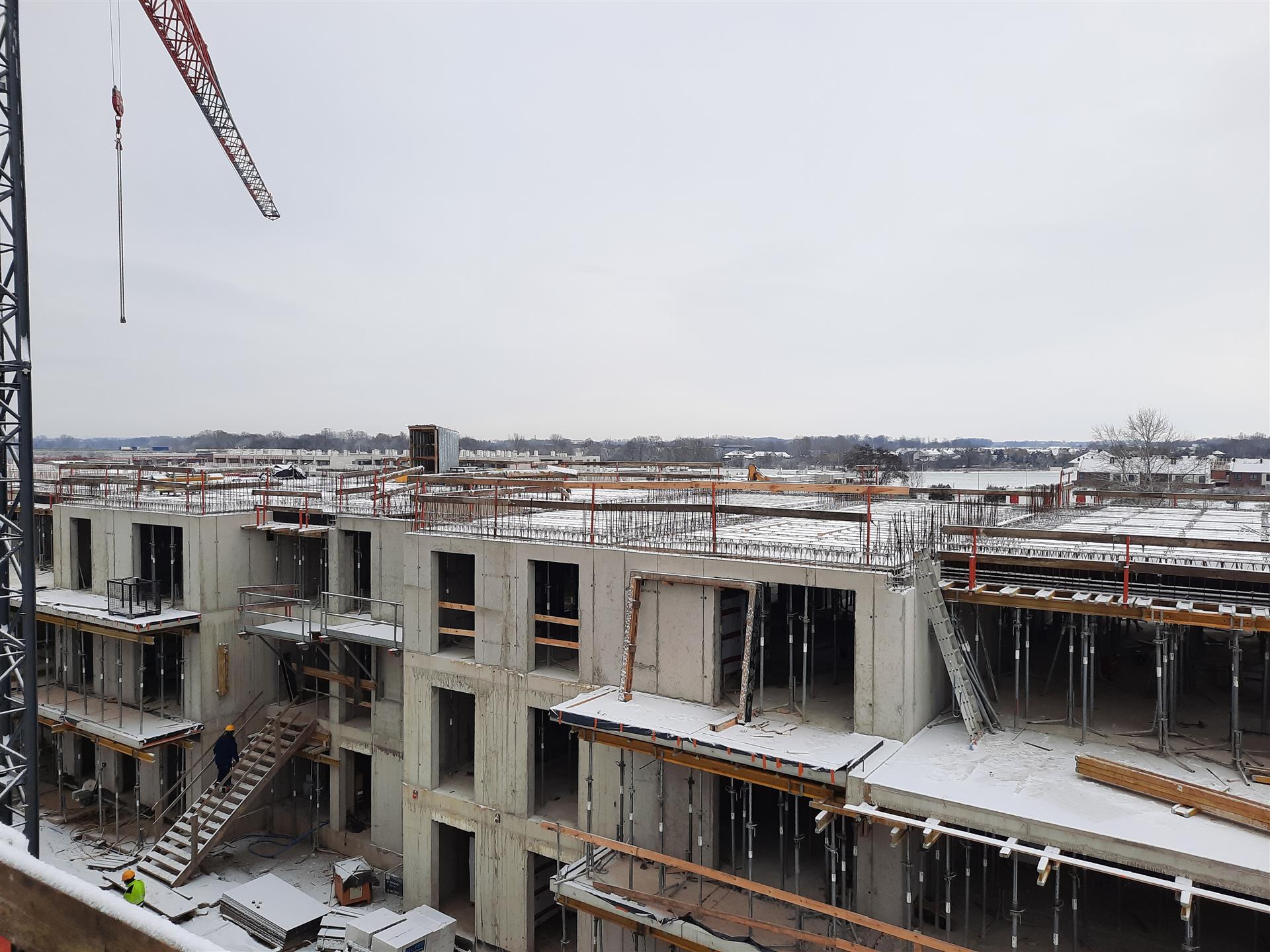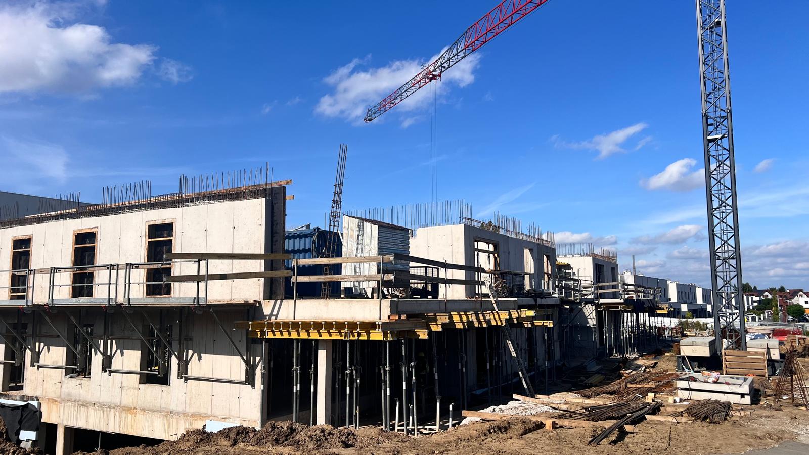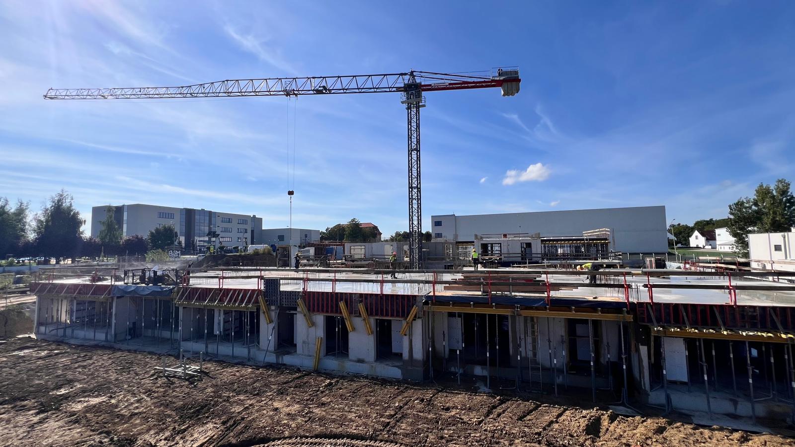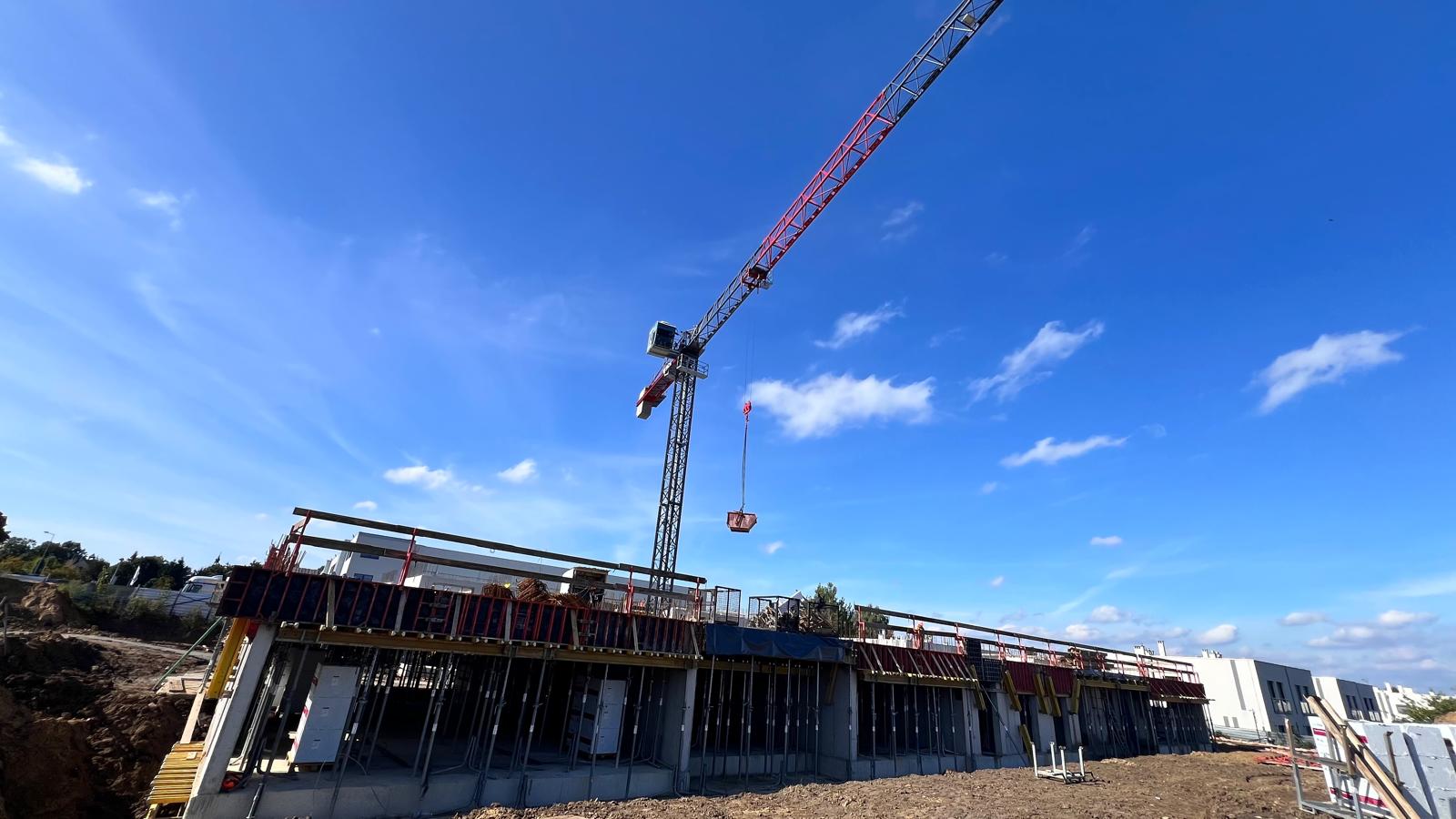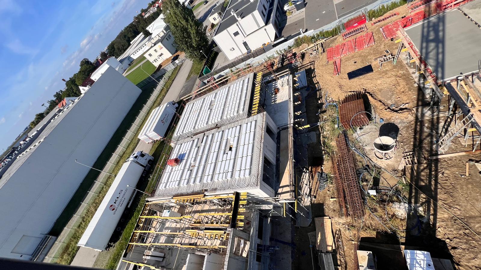 Wykonaliśmy konstrukcję kondygnacji podziemnych budynków 1 i 2 wraz z izolacją oraz ściany parteru. Trwają prace konstrukcyjne na 1 piętrze.